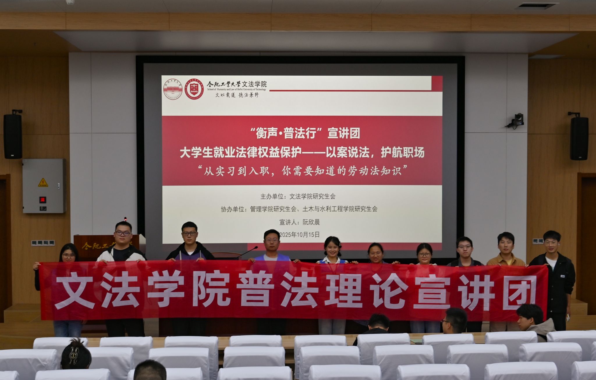 为帮助同学们提升劳动权益保护意识,10月15日下午四点,文法学院“衡声·普法行”宣讲团在屯溪路校区工程管理与智能制造研究中心第一报告厅举行了第24期普法宣讲活动。本次活动由宣讲团成员阮欣晨主讲,文法学院与管理学院、土木与水利工程学院研究生共同参与。