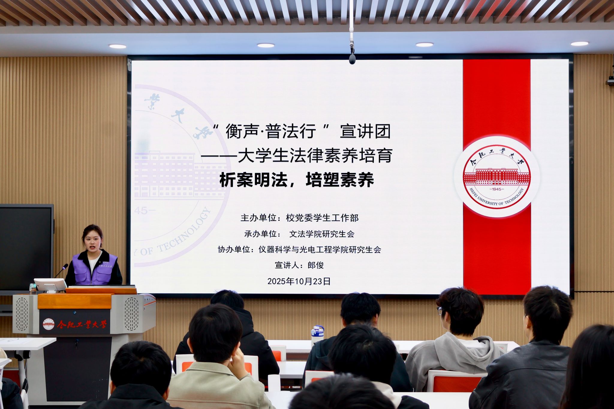 为提升研究生的法治观念和法律素养,10月23日下午六点,文法学院“衡声·普法行”宣讲团在屯溪路校区科技楼236报告厅举行了第25期普法宣讲活动。本次活动由宣讲团成员郎俊主讲,文法学院和仪器科学与光电工程学院研究生共同参与。