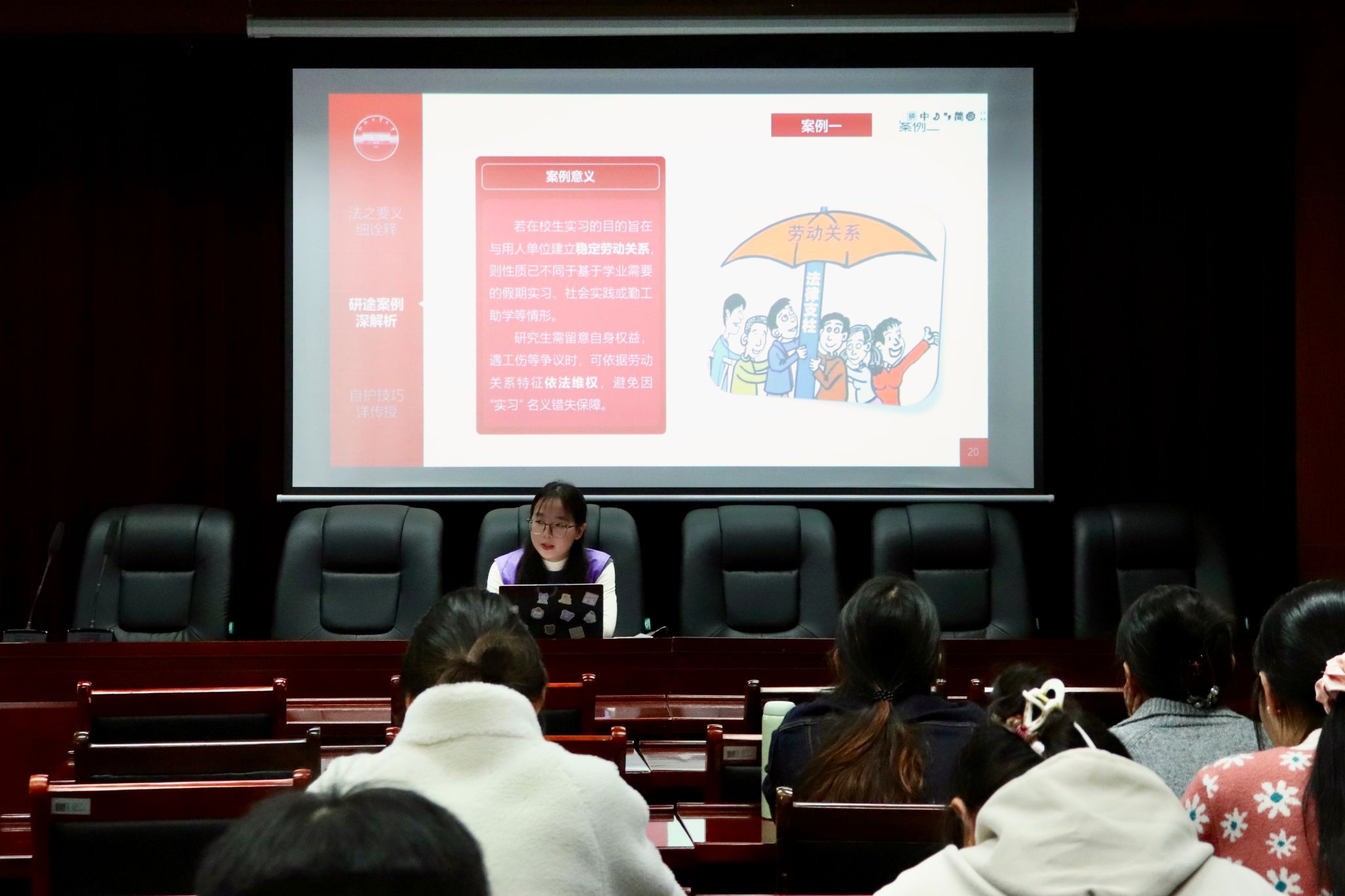 为切实提升学生维权能力,增强自我保护意识,11月7日下午两点,文法学院“衡声·普法行”宣讲团在翡翠湖校区建筑艺术馆613会议室开展了一场“析案明法,培塑素养”主题宣讲课。本次活动由宣讲团成员丁琳主讲,马克思主义学院研究生参与。