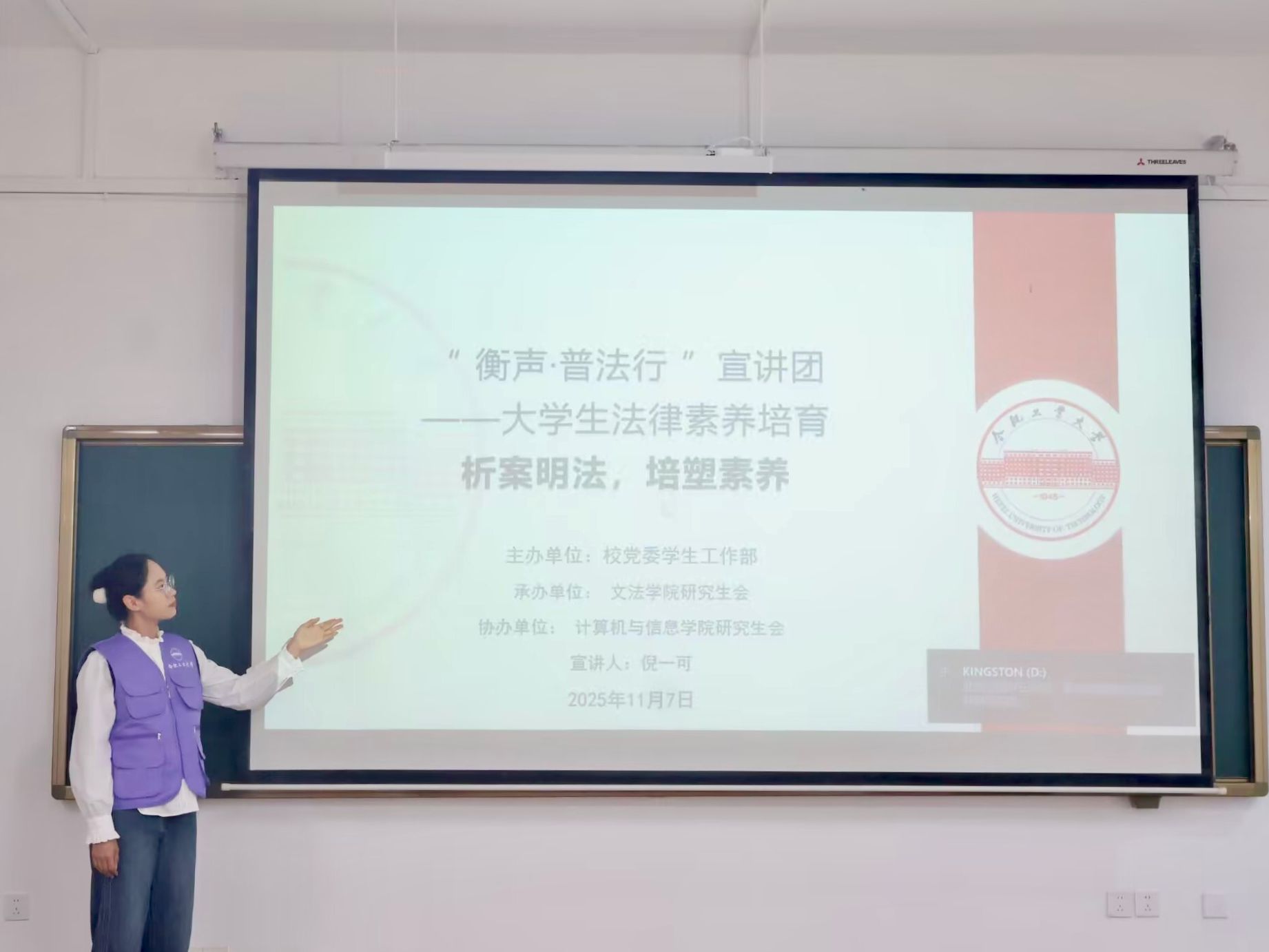 为切实提升同学们的法律意识,11月7日下午三点,文法学院“衡声·普法行”宣讲团在翡翠湖校区十号教学楼举行了第30期普法宣讲活动。本次活动由宣讲团成员倪一可主讲,计算机与信息学院研究生参与。