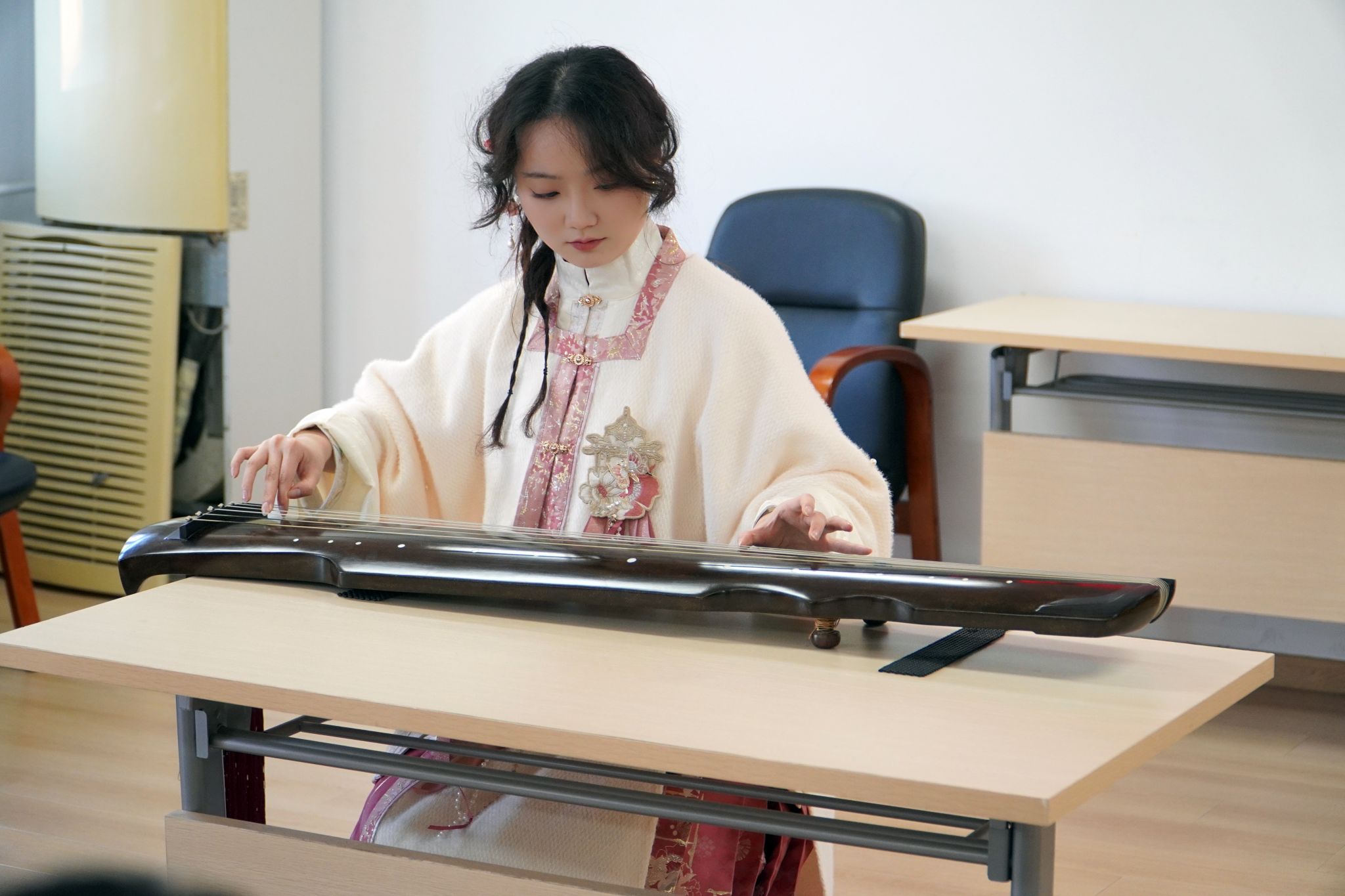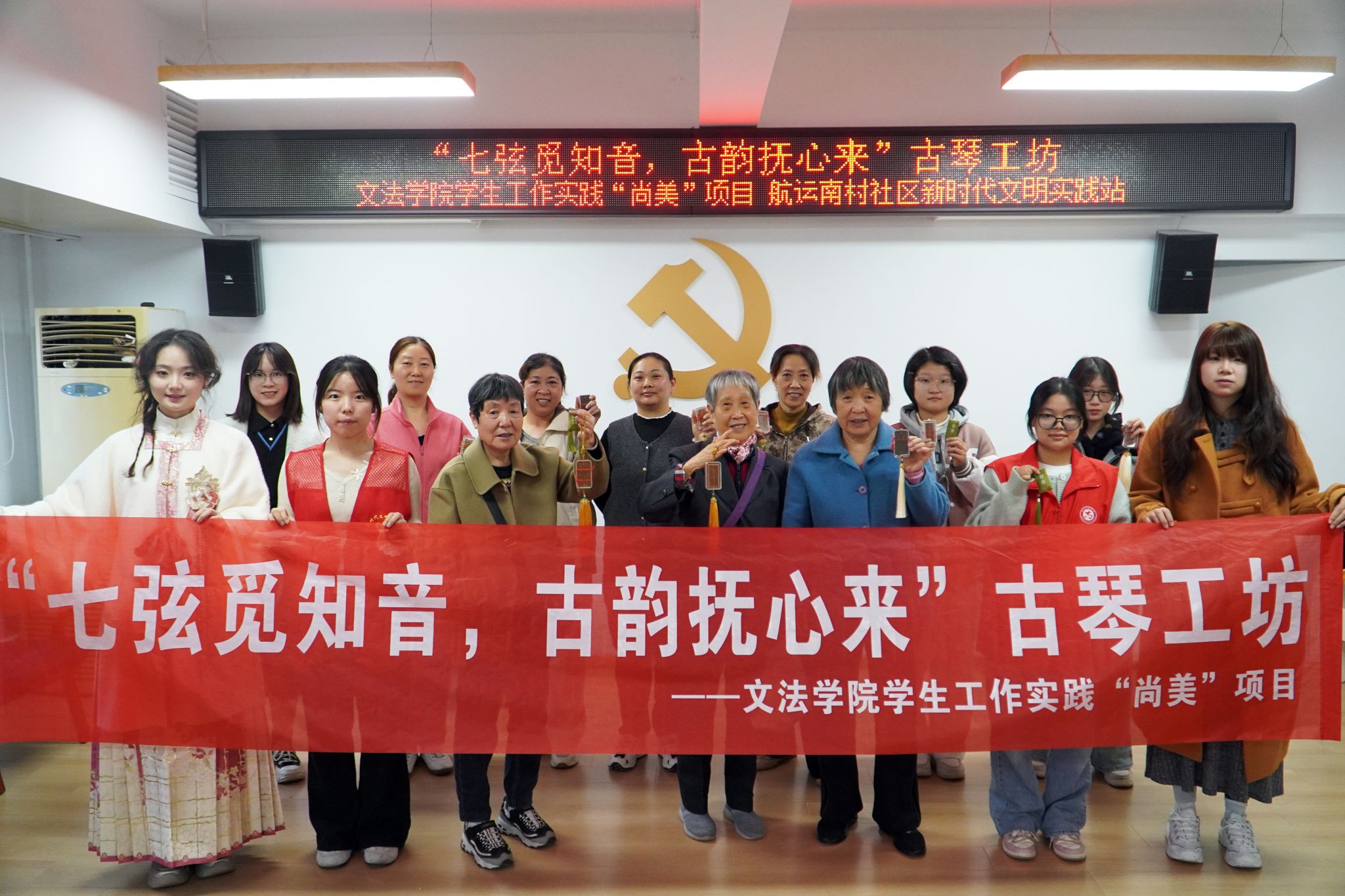 11月12日下午,学院“古琴工坊”走进航运南村社区,成功举办“以‘琴’会友,以‘香’为邻”主题文化活动。活动以古琴形香牌为创意载体,通过“听琴、识香、手作”相结合的方式,吸引了社区众多居民参与,现场氛围典雅温馨。