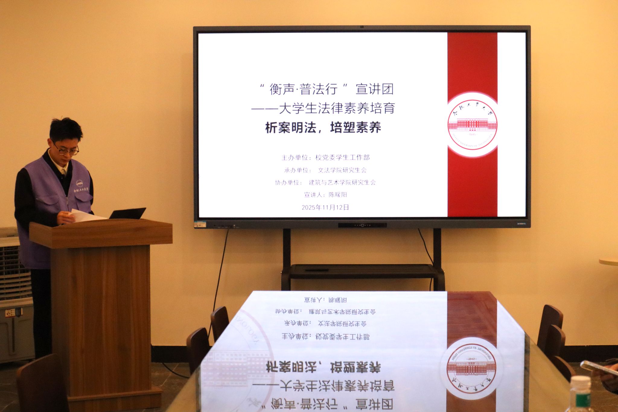为帮助大学生实现从“权利意识”到“法律能力”的转变,11月12日,文法学院“衡声·普法行”宣讲团于建艺馆举办“守护青春权益,提升法律素养”主题普法活动,由陈暖阳主讲,建筑与艺术学院研究生参与。