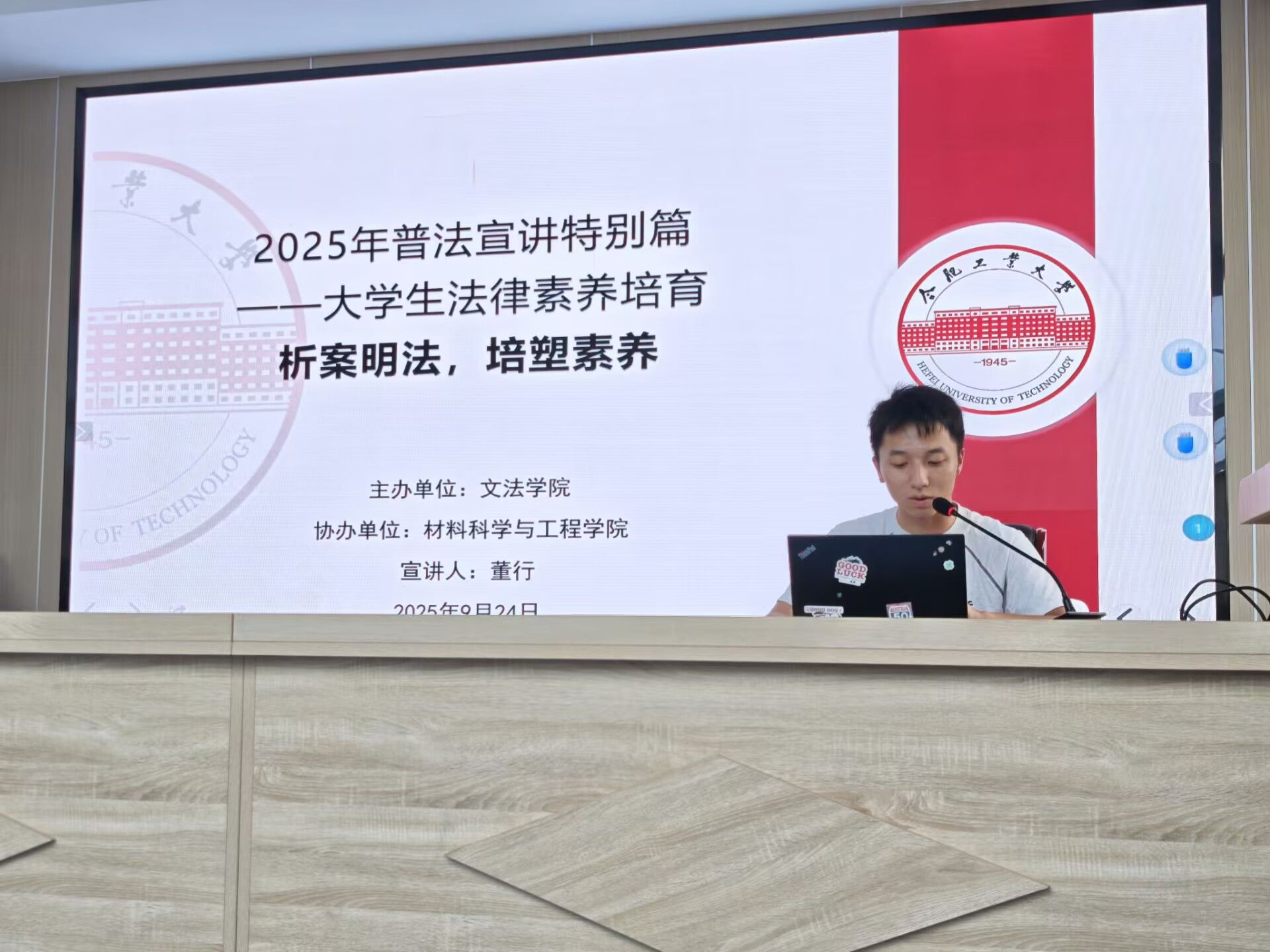 为切实提高大学生法律意识素养,9月24日,文法学院“衡声·普法行”宣讲团于屯溪路校区材料楼举办“守护青春权益,提升法律素养”主题普法活动,由董行主讲,材料科学与工程学院研究生参与。