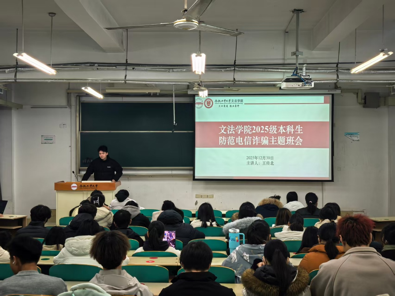 为提升学生识别与防范电信网络诈骗的能力,保障元旦假期安全,学院于12月30日在翠五教404教室开展防范电信诈骗与假期安全主题班会。本次班会由年级辅导员王传北主讲,2025级全体本科生参与。