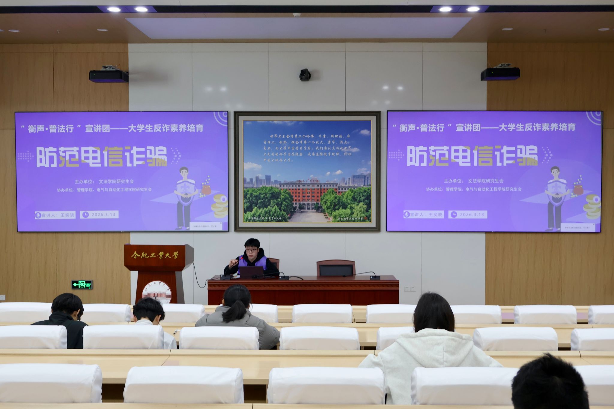 为提升大学生反诈意识与自我保护能力,3月13日,文法学院“衡声·普法行”宣讲团于工程管理与智能制造研究中心第二学术报告厅举办“防范电信诈骗”主题普法活动。本次活动由宣讲团成员王奕骁主讲,管理学院、电气与自动化工程学院70余名研究生参与。