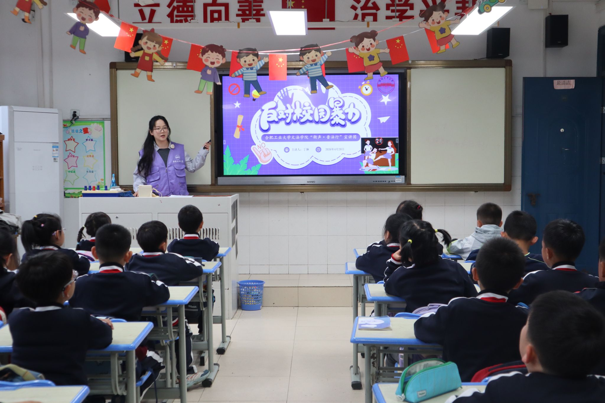 为切实提升学生的自我防护意识。4月20日下午,文法学院“衡声·普法行”宣讲团在合肥工业大学附属中学小学部开展了一场“反对校园暴力”主题宣讲课。本次活动由宣讲团成员丁琳主讲,一年级一班全体学生参与。