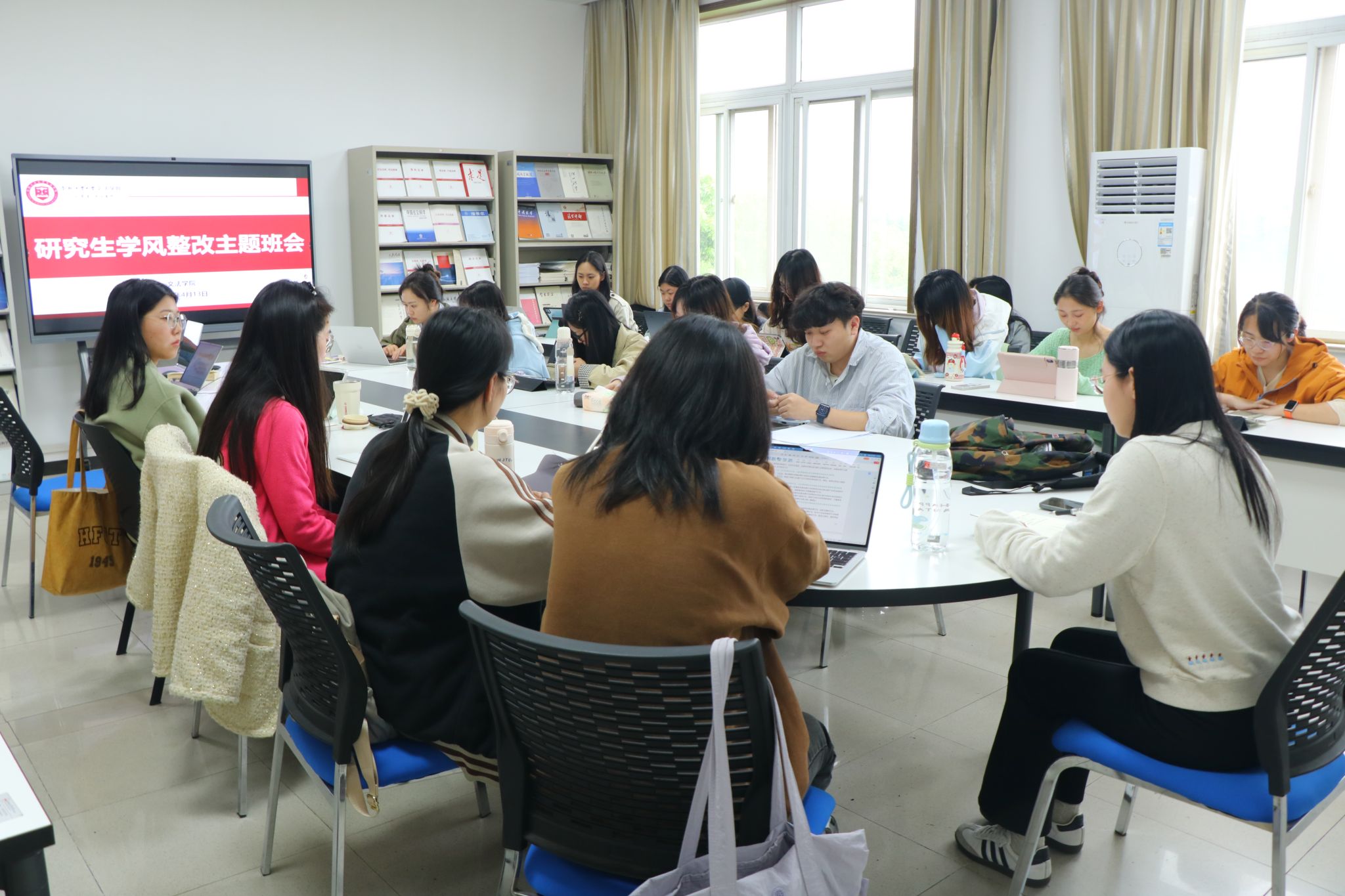 为加强学风班风建设,引导学生明确学习目标,4月13日,文法学院在学院楼410开展学风建设主题班会。本次班会由学生工作办公室主任朱曼婷主讲,学院2025级法律(非法学)班研究生参与。