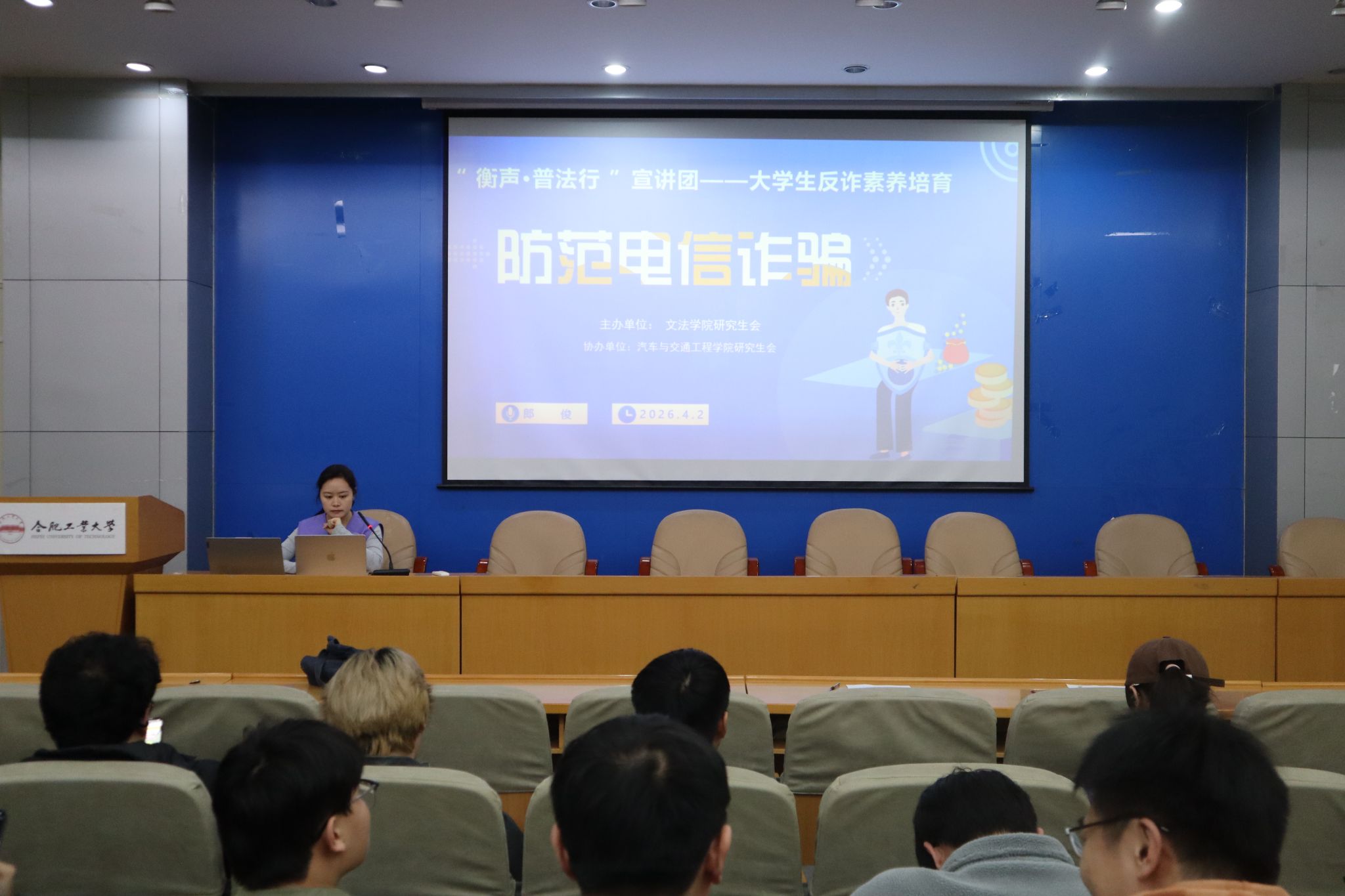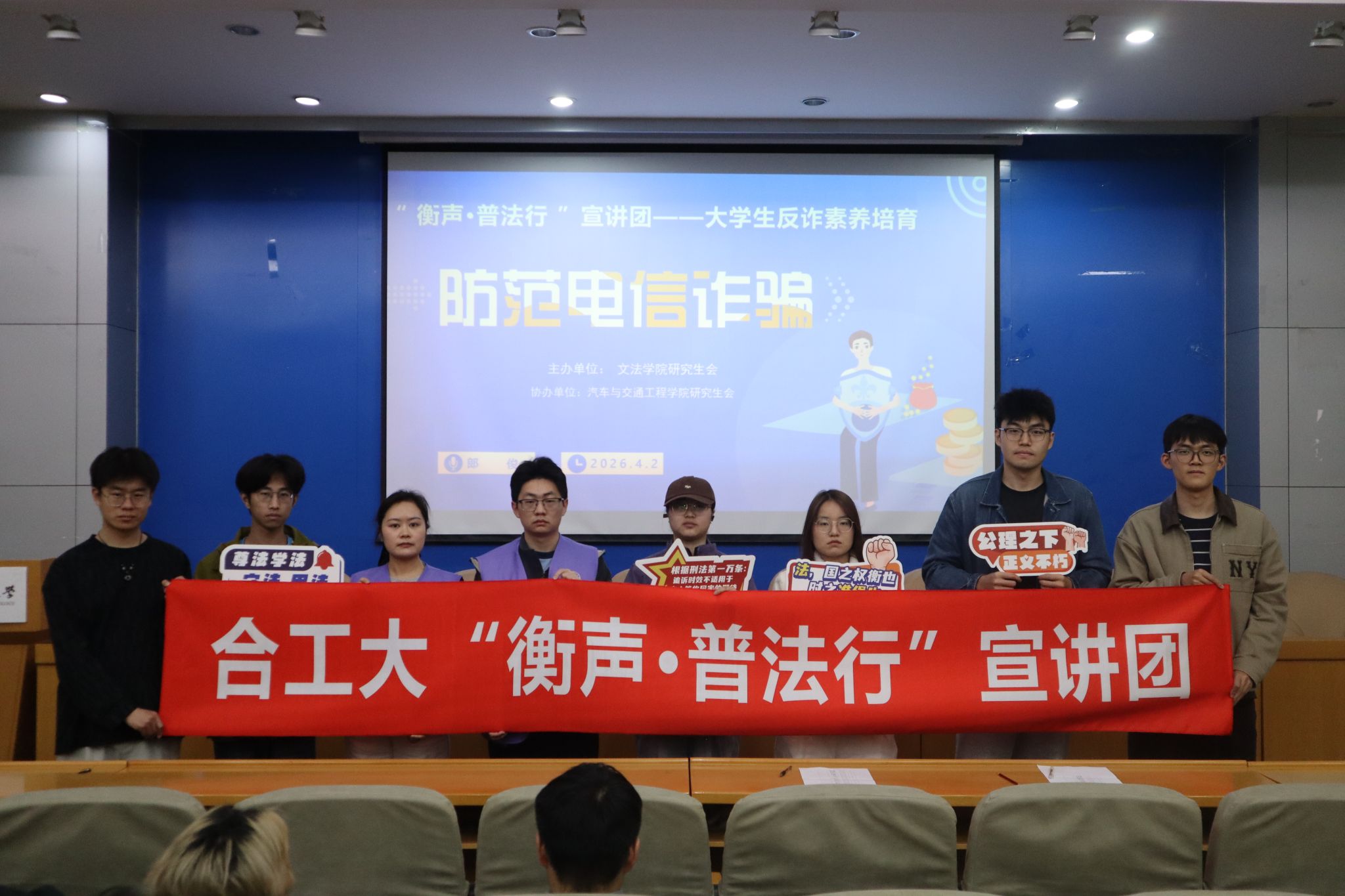 为提升学生反诈防诈意识,筑牢校园反诈安全防线,4月2日,学院“衡声·普法行”宣讲团在格物楼214开展第42期大学生反诈素养培育宣讲活动。本次活动由文法学院主办,宣讲团成员郎俊主讲,汽车与交通工程学院研究生参与。