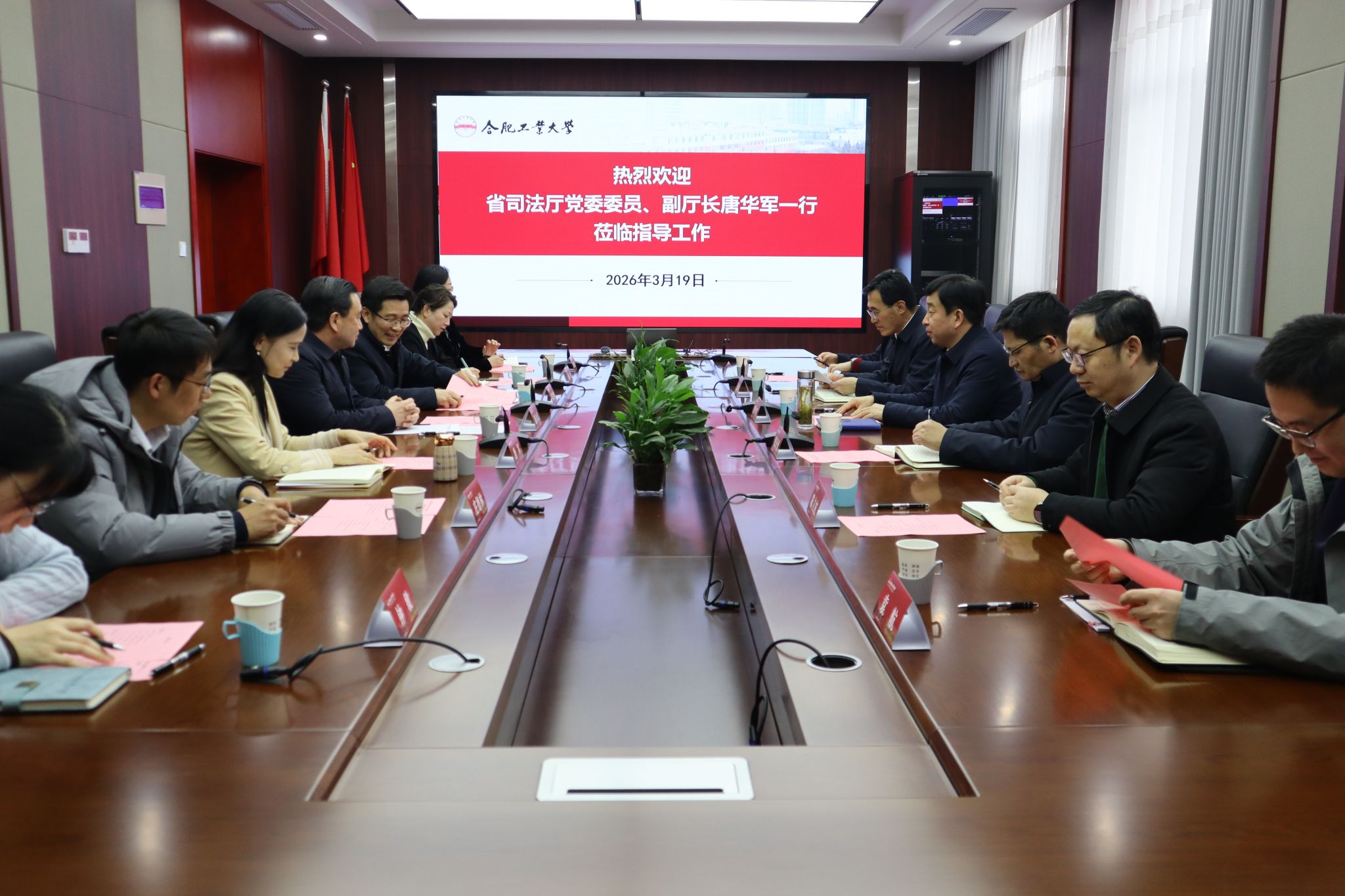 唐华军对学校近年来取得的显著办学成果及涉外法治人才培养成效给予高度评价。他表示,当前安徽正处于高质量发展关键期,新能源汽车、低空经济等新兴产业加速出海,涉外法治人才短缺、企业海外法律风险防控薄弱等问题亟待破解,省司法厅将全力搭建校地合作桥梁,盘活优质资源补齐短板,希望依托合肥工业大学的学科优势、人才优势与科研优势,深化厅校协同联动,补齐涉外法治建设短板,为安徽高质量发展筑牢法治根基。